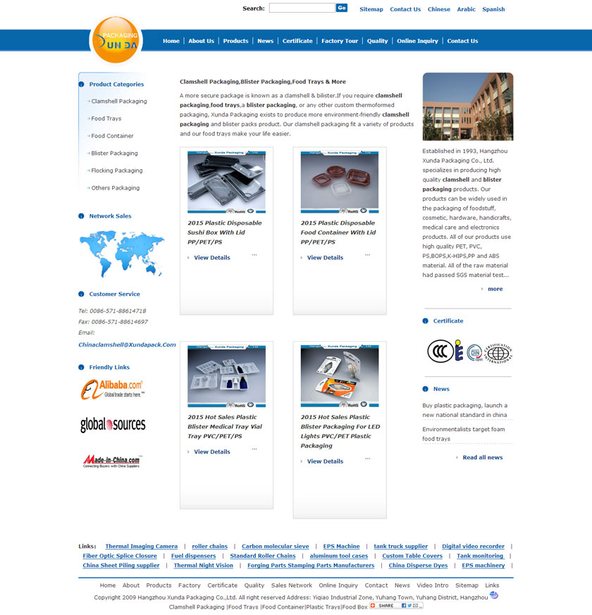迅達(dá)公司現(xiàn)擁有多條大型進(jìn)口全自動(dòng)吸塑成型機(jī)流水線和液壓龍門裁斷機(jī)、自動(dòng)折邊機(jī)、折盒壓痕機(jī),以及多種吸塑專業(yè)配套設(shè)備.公司還配有專業(yè)模具設(shè)計(jì)制造人員,能按照客戶需要開發(fā)不同類型的吸塑模具.我們3天出樣,7天既可批量生產(chǎn),年生產(chǎn)規(guī)模達(dá)5000噸.現(xiàn)主要應(yīng)用優(yōu)質(zhì)的PVC、PET、PP、PS、GAG、植絨、抗靜電、導(dǎo)電等多種材料,生產(chǎn)高檔次及多種規(guī)格的吸塑包裝制品,質(zhì)優(yōu)、價(jià)廉、高效地為外銷、內(nèi)銷產(chǎn)品配套生產(chǎn)高質(zhì)量吸塑包裝、折盒、圓筒、抗靜電、導(dǎo)電產(chǎn)品等。迅達(dá)公司產(chǎn)品廣泛應(yīng)用于電子、食品、日用品、醫(yī)藥保健品、工具、五金、化妝品等行業(yè),深得用戶好評,并建立起了長期信賴的合作關(guān)系。公司已通過ISO9001:2000及ISO14001體系認(rèn)證及美國FDA認(rèn)證,并即將通過QS9000認(rèn)證,公司自有ROHS檢測儀,能保證達(dá)到歐盟標(biāo)準(zhǔn)。產(chǎn)品除為國內(nèi)企業(yè)配套外,還出口歐美、日本、中東、非洲、澳洲,是多家國際著名公司產(chǎn)品定點(diǎn)供應(yīng)商,是華東地區(qū)吸塑包裝主要生產(chǎn)企業(yè)。